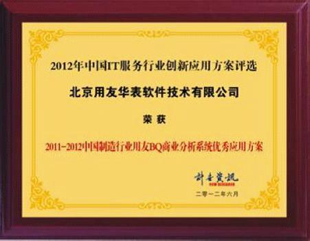 7月16日,用友BQ商业分析获“2012中国IT服务创新应用方案奖”。国内商业智能领军企业用友华表的核心产品用友BQ商业分析,在制造行业的应用方案被评为“2012年中国IT服务行业创新应用方案”。