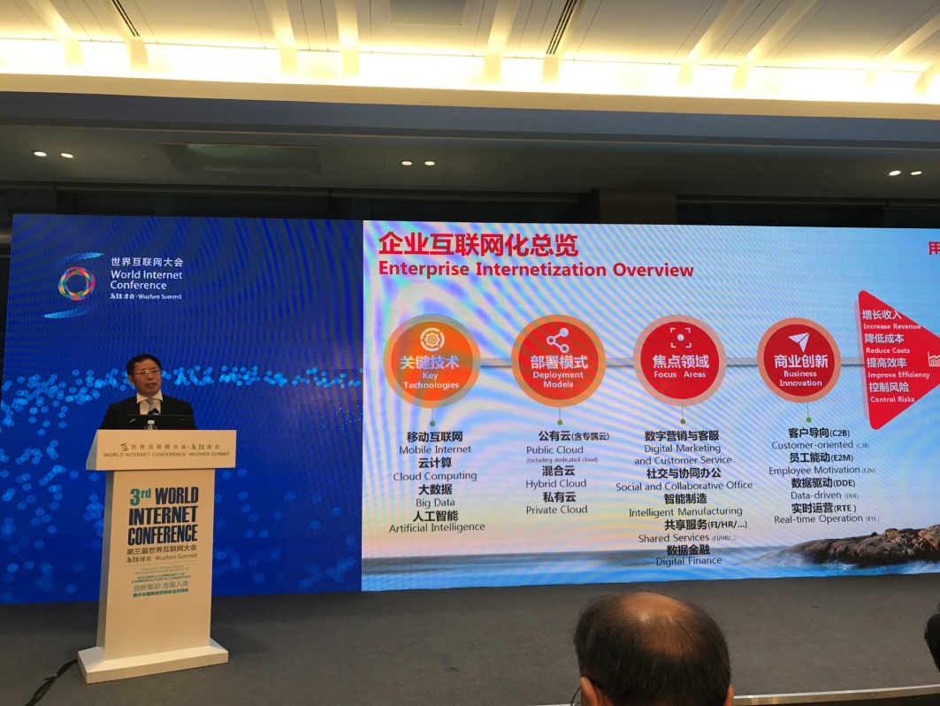 由中国电子信息行业联合会和中国互联网协会联合主办的第三届世界互联网大会在乌镇召开,用友董事长兼CEO王文京出席互联网企业家论坛,发表“普及企业互联网化”主题发表演讲。