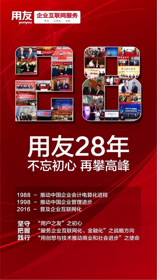 用友创立28周年,以“服务企业互联网化、金融化”为战略方向,以“软件、云服务、金融”为三大核心业务,2016年,用友迈入全新的战略阶段:用友3.0!
